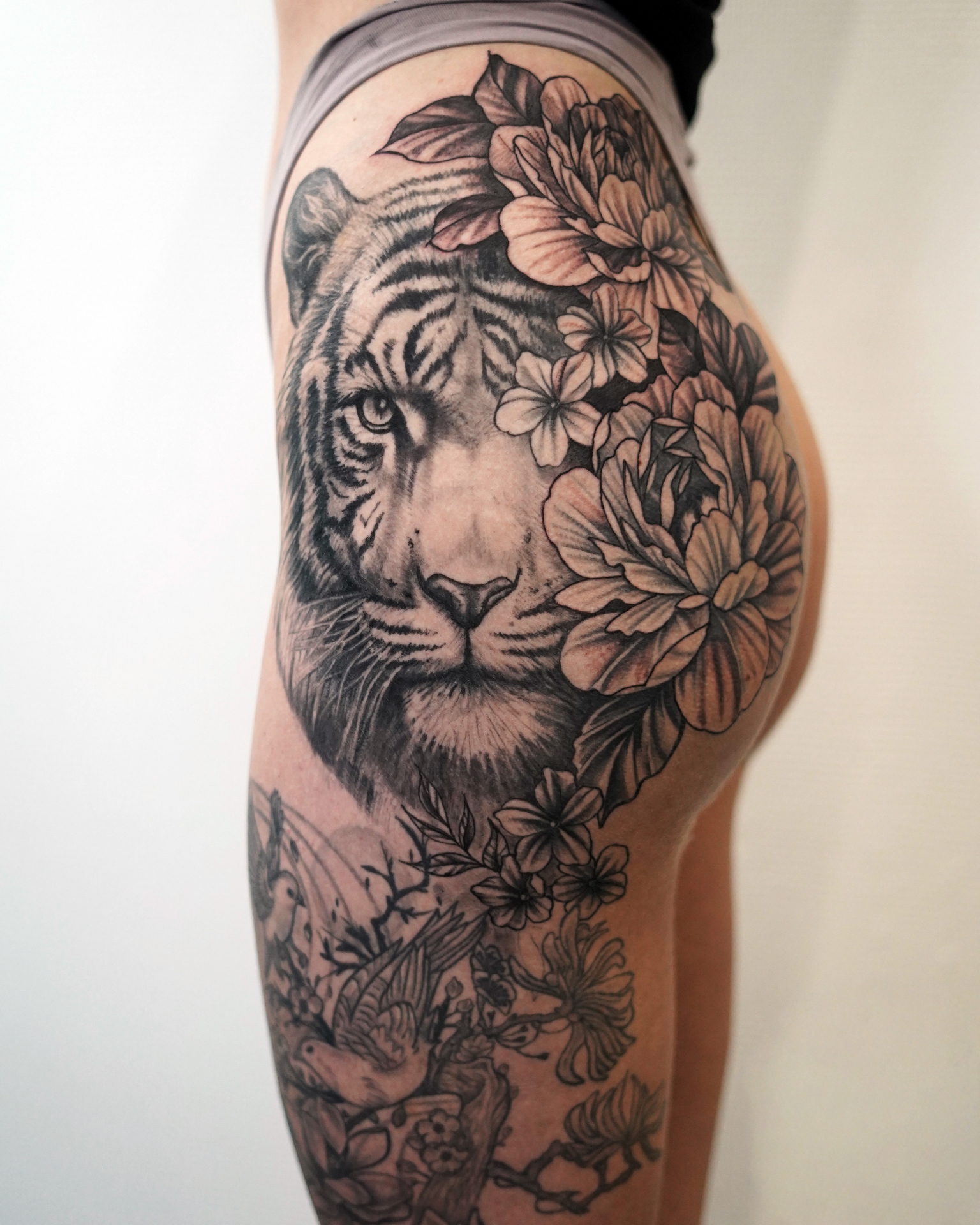Tattoos i sort og grå kan gengive motivet næsten som et foto med fokus på lys, skygge og realisme.
